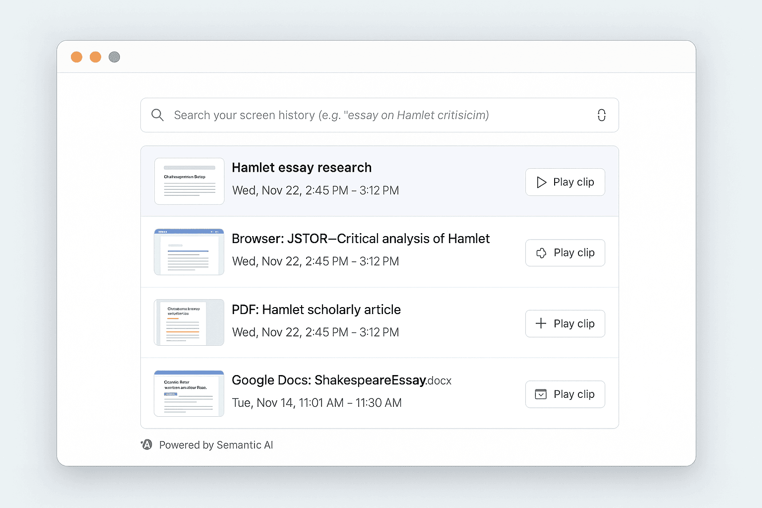 Yes! ScreenProof uses AI-powered semantic indexing to make your screen content searchable by meaning. Simply ask questions like "Show me work on my Shakespeare essay" and get instant results.