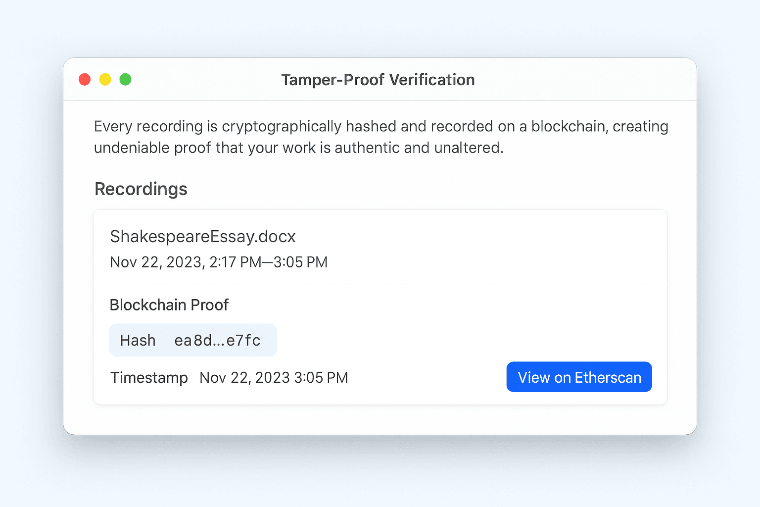 Everything you need to document, verify, and showcase your authentic academic efforts with cryptographic proof that can't be faked.