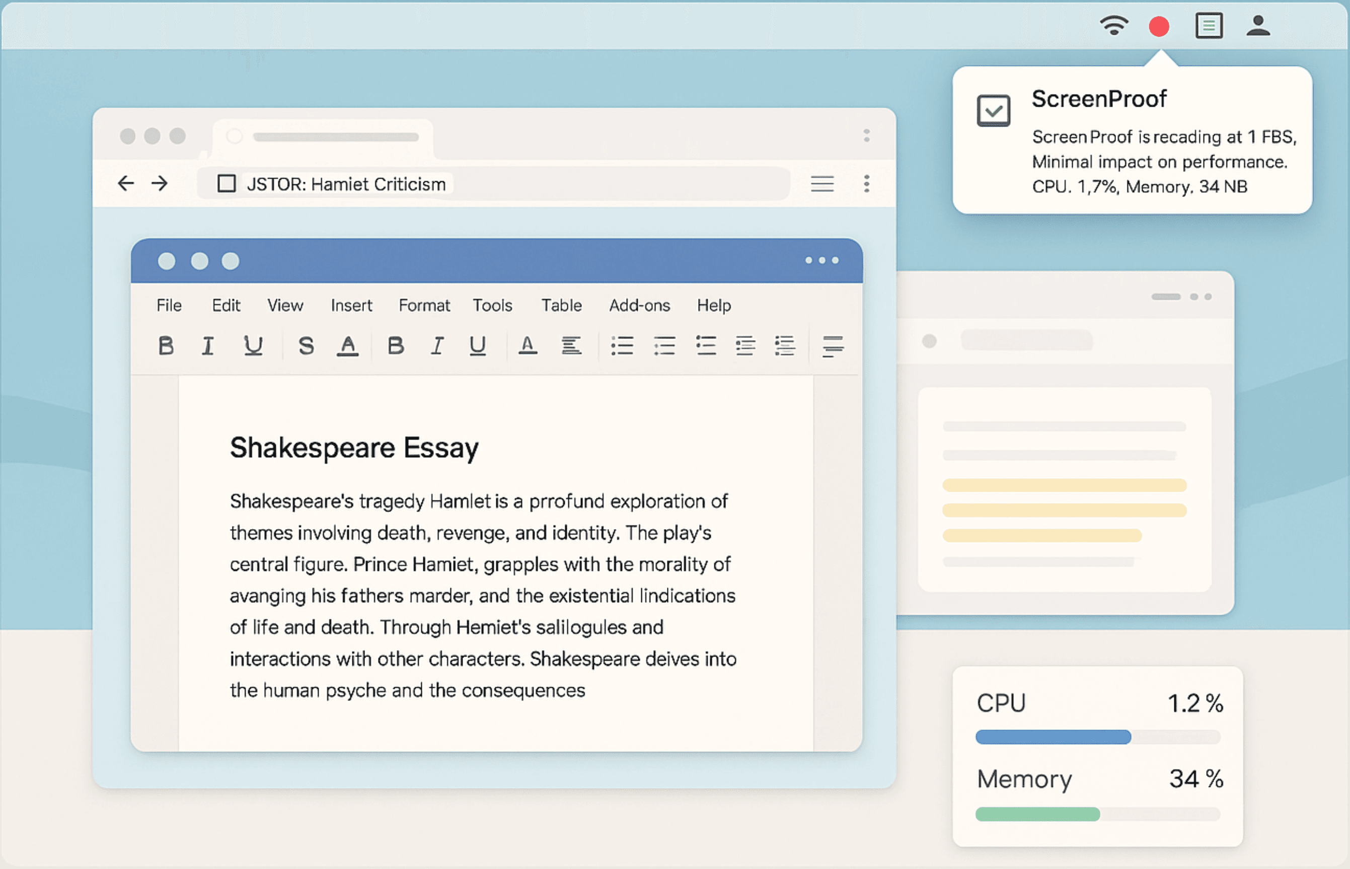 ScreenProof continuously captures your screen at 1 frame per second using efficient AV1 compression, creating a complete "paper trail" of your academic work with minimal storage and performance overhead.