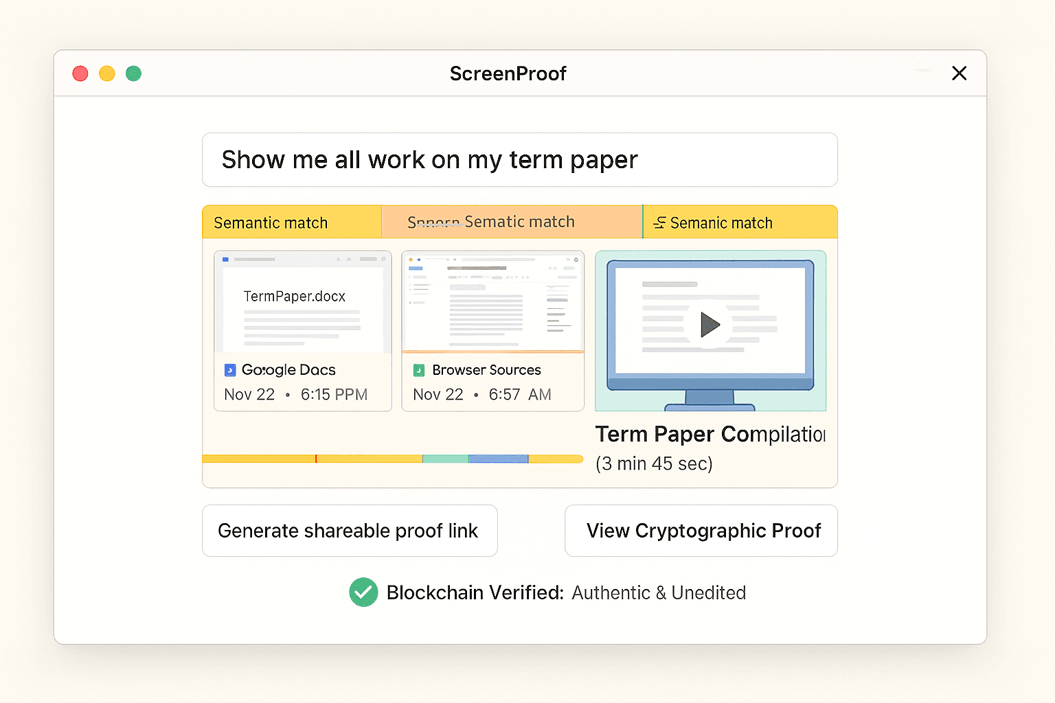 ScreenProof provides secure, continuous recording of your screen activity with blockchain-backed verification. Show your process, prove your work, and search your screen history with semantic indexing.